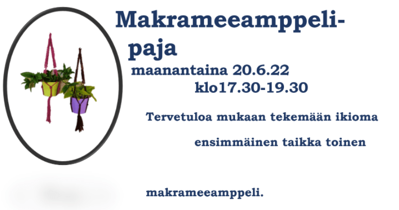 Tämä paja soveltuu aloittelijalle, jos vasen ja oikea on hallussa, ja pystyt jo hieman ohjeiden mukaan itsenäiseen työhön odotellessasi. Opettelemme muutaman perussolmun, joilla teet näyttävätkin amppelit kotiin tai parvekkeelle.